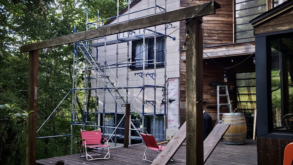 雪害による補修工事といってしまえばそれは簡単ですね。がわたしは補修工事の位置付はなく、あくまで大切な宿づくりとして認識しているところです。なので自らが作業全般にチャレンジします。わたしは汗を流し、時にその汗臭さにブヨに襲われながら、ペンキまみれになります。どうですか?いいでしょ?小さな宿屋ですからある程度のことは自分で作業対応が取れるよう、大工の富ちゃんからもさまざまなアドバイスを受けているところなのです。