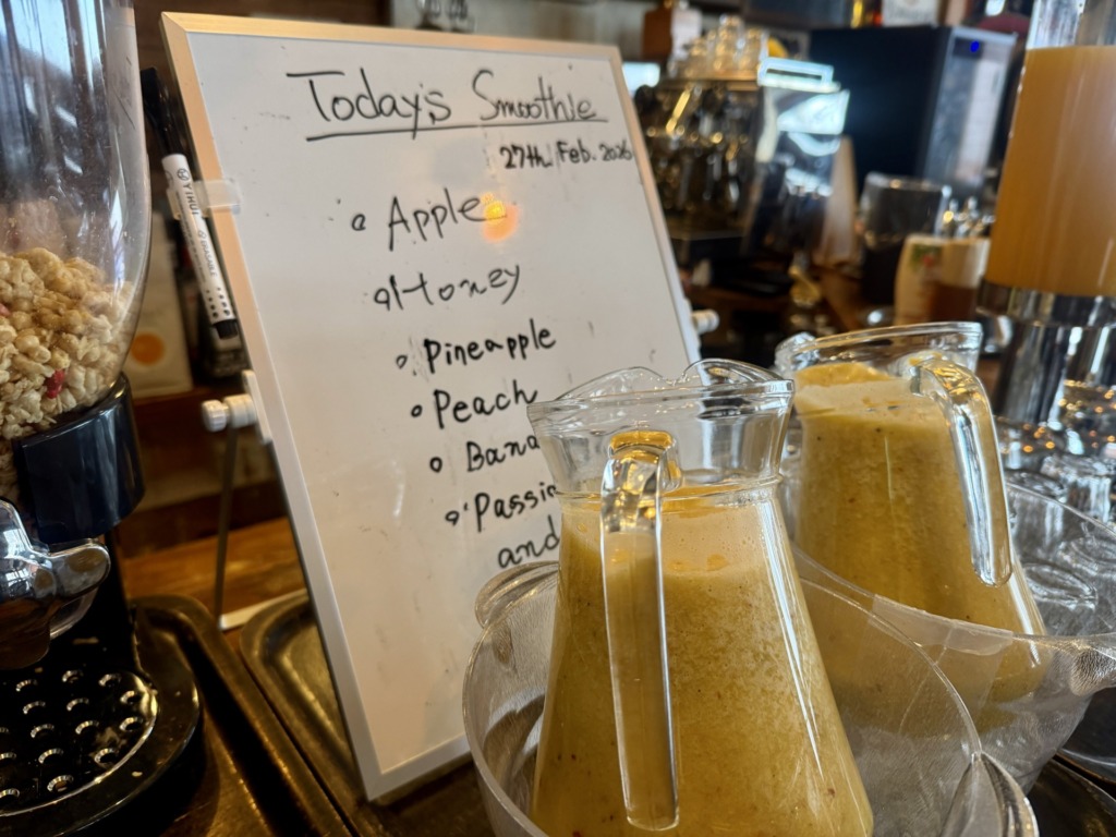 他にもフレッシュオレンジジュース、ミルク、シリアル2種、オプションでピッコロやカプチーノ、エスプレッソダブルが揃う賑やかな朝食です。そんな賑やかな朝、スムージーは花形ですね。なぜならみなさん朝の一杯はここから!そんな笑顔もあるから。