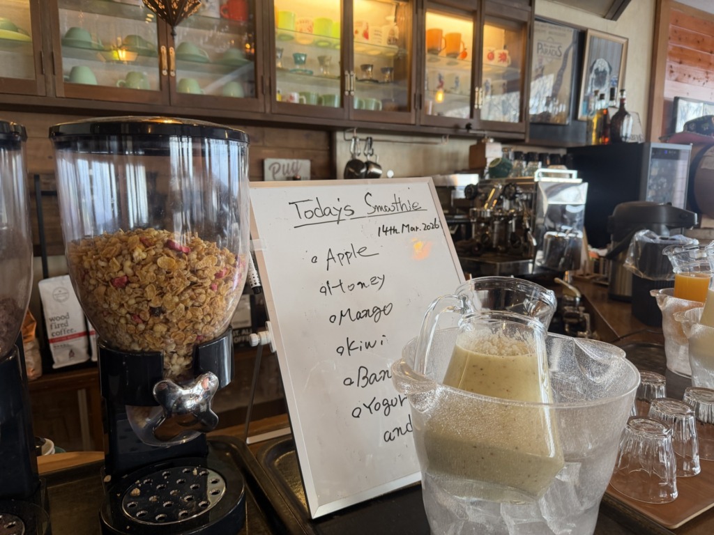 今シーズンは昨年12月12日からスタートしました。以来3ヶ月を過ぎても毎朝欠かさず提供しているスペシャルメニューがあります。それはテゾーロ奥志賀オリジナルのスペシャルスムージーです。日々レシピが変わります。ママさんの愛情スパイスも加わりすべては朝の美味しいのために。